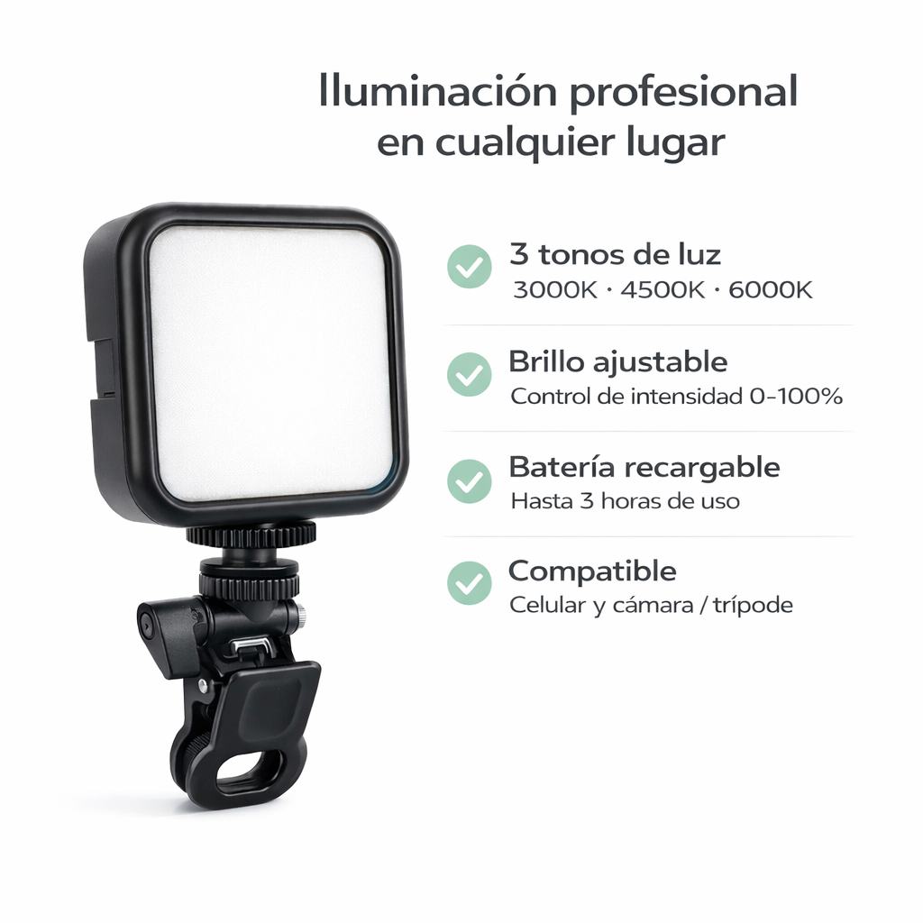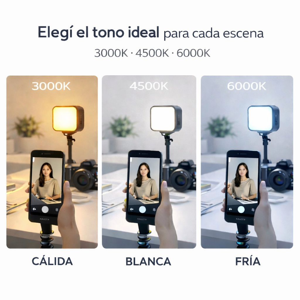 Luz Blanca Natural Ajustable: Ofrece tonalidades claras y precisas, ideales para lograr imágenes y videos con colores reales y bien definidos.
