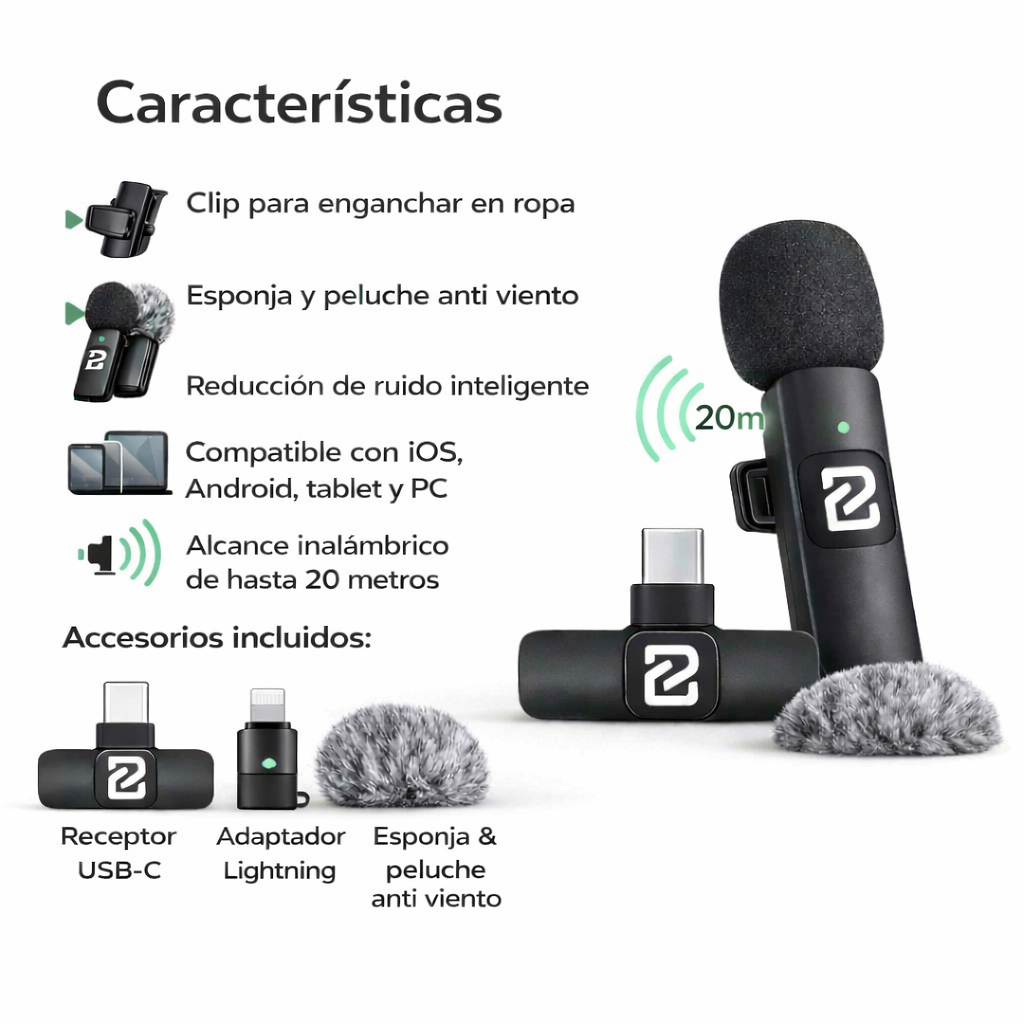 - Alcance de Hasta 20 Metros: Gozá de libertad de movimiento mientras grabás, ideal para entrevistas y presentaciones.